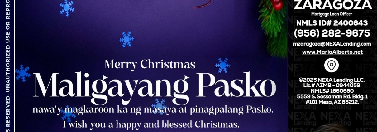 Maligayang Pasko - Mario Zaragoza -Mortgage Loan OfficerHi, my name is Mario Zaragoza. I’m a Loan Officer with NEXA Lending LLC., offering personalized mortgage solutions, fast customized quotes, great rates and service with integrity.