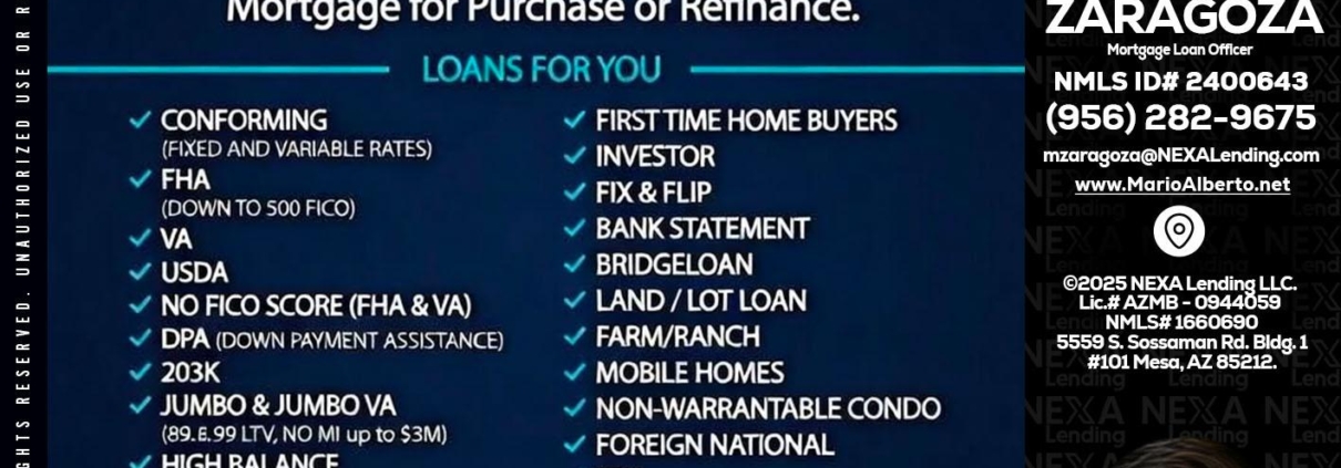 Hi, my name is Mario Zaragoza. I’m a Loan Officer with NEXA Lending LLC., offering personalized mortgage solutions, fast customized quotes, great rates and service with integrity.