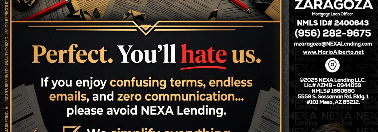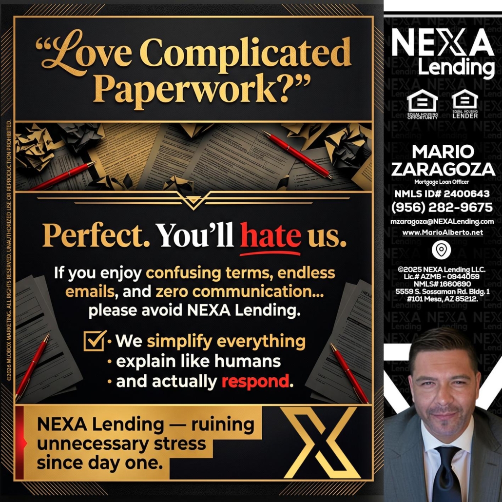 YOU WILL HATE US! - Mario Zaragoza -Mortgage Loan OfficerHi, my name is Mario Zaragoza. I’m a Loan Officer with NEXA Lending LLC., offering personalized mortgage solutions, fast customized quotes, great rates and service with integrity.